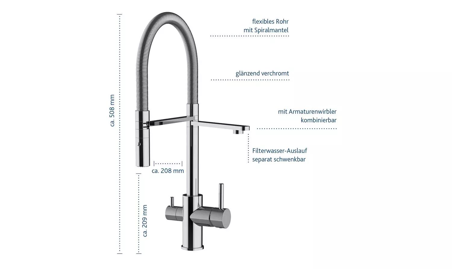 3-Wege-Design-Armatur Levanto verchromt mit flexiblem, spiralummanteltem Auslaufrohr und separatem Auslauf für gefiltertes Wasser.