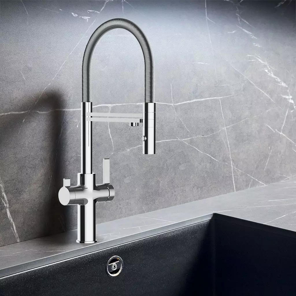 Mit ihrem modernen Design und einer Höhe von fast 50 cm, wird die Armatur Levanto garantiert zu einem optischen Highlight in jeder Küche. Sie ist hochglanz-verchromt und das flexible Auslaufrohr kann von der Halterung gelöst und als Brause genutzt werden. Der Filterwasser-Auslauf befindet sich an einem separaten schwenkbaren Arm. Man kann sie als reguläre 3-Wege-Armatur für Kalt/Warm- und Filterwasser nutzen oder bei Bedarf mit einer Sprudelanlage erweitern. Für eine zusätzliche Belebung des Filterwassers, kann ein Wirbler mit dem Adapter 722 angeschlossen werden (separat erhältlich).