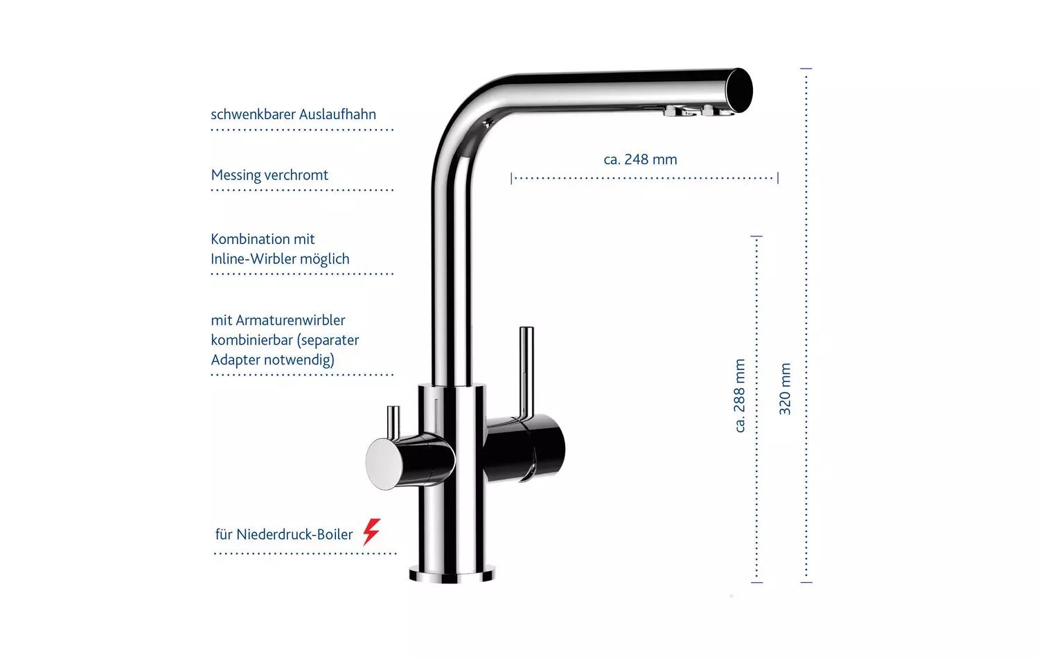 - Auslaufhöhe über Arbeitsplatte: ca. 288mm