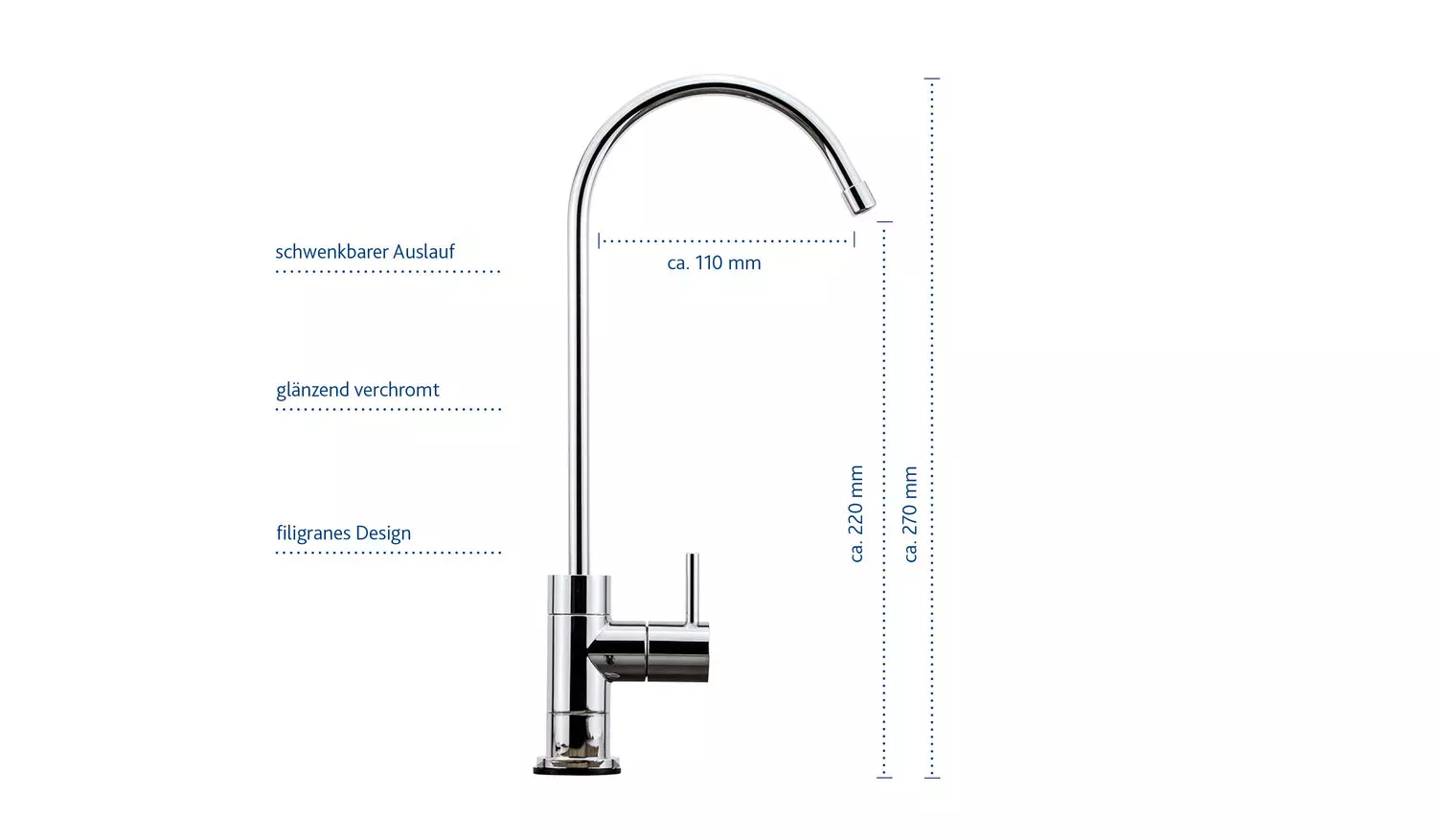 Alvitos eleganter 1-Wege-Wasserhahn Genua besticht durch seinen schwenkbaren, verchromten Auslauf und eignet sich ideal für den Anschluss an ein Einbaufiltersystem. Der Wasserhahn wird in einem zusätzlichen Loch in der Arbeitsplatte oder Spüle montiert, für das ein Durchmesser von 12 mm erforderlich ist.