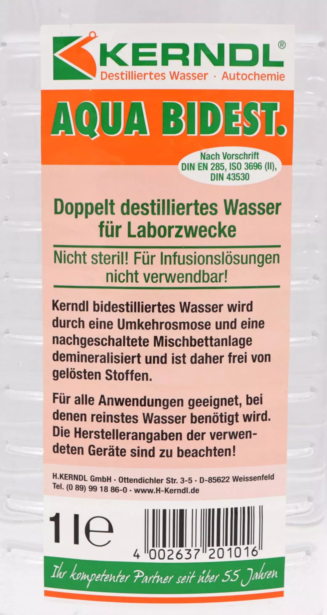 KERNDL Bidestilliertes Wasser ist durch eine Umkehrosmose und eine nachgeschaltete Mischbettanlage demineralisiert worden, daher ist es frei von gelösten Stoffen und für alle Anwendungen, bei denen reinstes Wasser benötigt wird, geeignet.