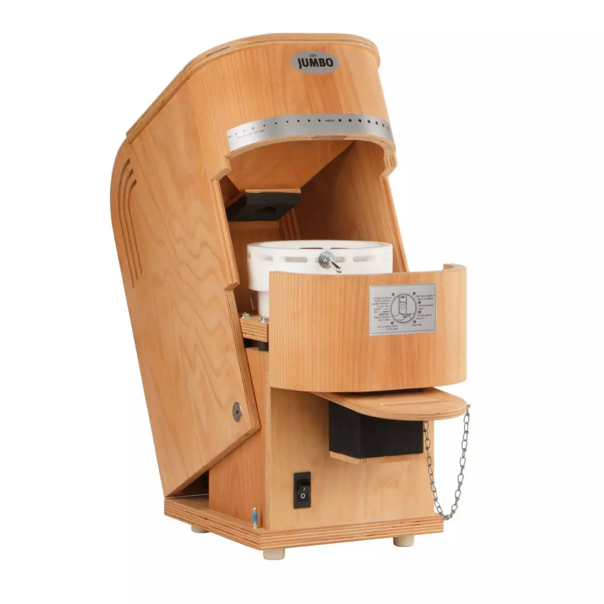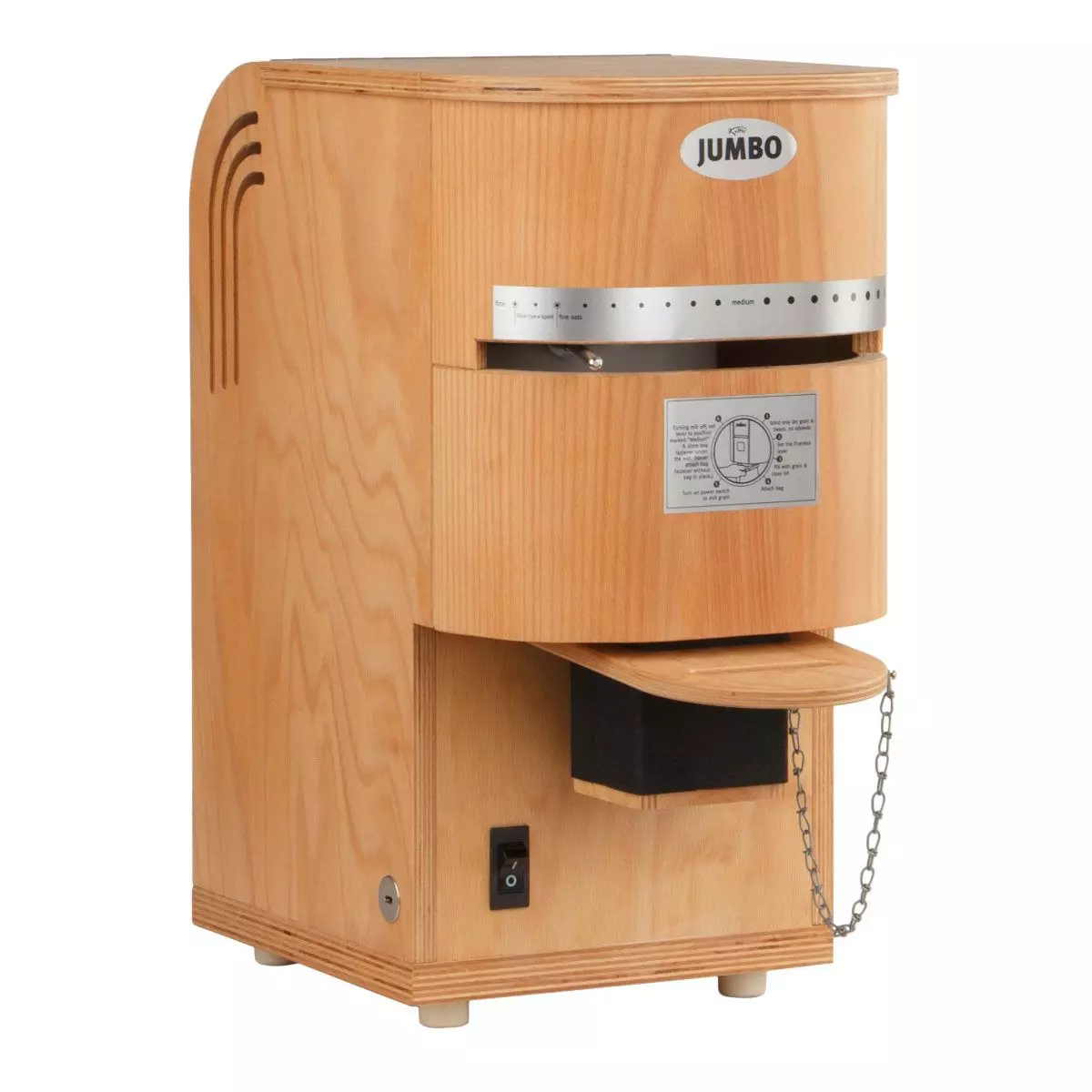 Das Arbeitstier unter den Mühlen, welche alle Getreidearten und sogar Mais zu feinem Mehl verarbeitet. 25kg Getreide können ohne Pause vermahlen werden. Nach einer Stunde Nutzungsdauer sollte die Mühle aber eine Weile abkühlen können. Extra große Mahlsteine aus Korund-Keramik sowie ein leistungsstarker Industriemotor geben der Jumbo die Kraft, die sie für den Einsatz in Läden, Restaurants und Großküchen benötigt. Das Gehäuse ist robust und mit einem großen Hebel zur stufenlosen Einstellung des Mahlgrades ausgestattet. Ein Blick auf die Anleitungsgrafik auf der Front genügt, um die genial einfache Bedienung des Gerätes nachzuvollziehen. Wir haben hier auch einen Hinweis angebracht, dass Ölsaaten oder Nüsse nicht vermahlen werden dürfen. Auf einer großen Skala findet man eigene Markierungen für Hafer und Roggen, so dass eine Selbstbedienung in Bioläden reibungslos funktioniert. Eine Halterung sorgt dafür, dass das Mahlgut direkt in der Tüte landen kann – schön staubfrei. Das alles und der große, praktische Trichter machen diese Profi Getreidemühle zu der perfekten Ladenmühle für Reformhäusern und Bioläden.