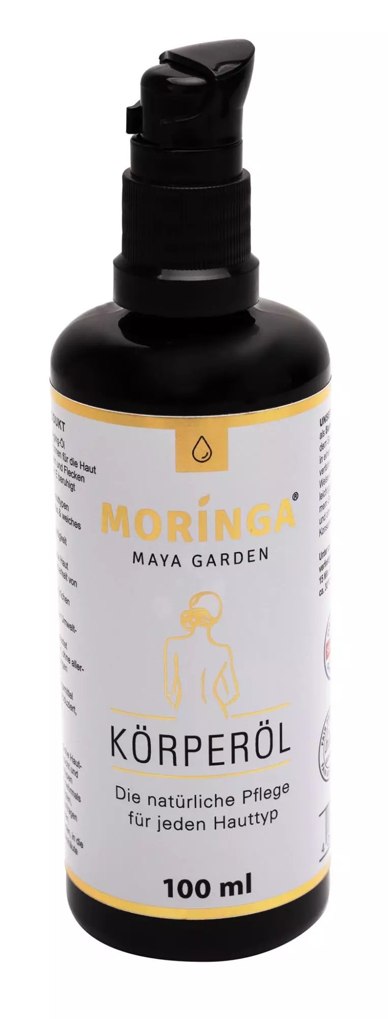 Maya Garden Moringa Pflegeöl: Zertifizierte Haut-, Gesichts-, & HaarpflegeDas Premium Öl wird aus den Samen der Moringa Oleifera durch ein speziell entwickeltes, sehr schonendes Kaltpressverfahren gewonnen. Durch diese schonende Verarbeitung bleibt die Vielzahl der wertvollen Inhaltsstoffe erhalten.Reich an Antioxidantien gegen freie Radikale & Hautalterung. Die Moringa Samen sind so wertvoll, da sie eine Vielzahl an Vitaminen A, B, B1, B2, B3, C, D, E, K & P, sowie die wertvollen ungesättigten Fettsäuren & Behensäure enthalten.Omega 9 ist ein wichtiger Bestandteil für Geschmeidigkeit von Haut & Haaren. Gesichtspflege, Hautpflege, Haarpflege: Verwendbar für alle Hauttypen. Für die Hautpflege, speziell als Hautöl für das Gesicht, für die Haare oder als Massageöl.Dermatest bestätigt: Hautverträglichkeit sehr gut! 100% reines, unraffiniertes Moringaöl aus natürlich wertvollem Anbau - ohne künstliche Zusatzstoffe, Farbstoffe, Duftstoffe oder Konservierungsstoffe – einfach in der Anwendung.Der gesamte Prozess vom Feld bis zum Kunden liegt in einer Hand: Der Anbau, die Ernte, die Verarbeitung, das Abfüllen & Verpacken. Daher garantiert auch frei von Düngemitteln & Pestiziden. Eine erstklassige laborgeprüfte Qualität!Die Qualitätsgarantie – Entwicklungshilfe auf höchstem NiveauAb dem Samen, bis zum fertigen Erzeugnis hat Maya Garden die ganze Wertschöpfungskette in der Hand & ist dabei Entwicklungshelfer in Nicaragua. Kleinbauern werden begleitet, um auf mineralstoffreichen vulkanischen Böden nach traditioneller, natürlicher Anbaukultur anzubauen. Die Rohstoffe werden streng im Labor überprüft. Unser Sicherheitsversprechen: Viele Hersteller meiden aus Kostengründen die Registrierung & Prüfung. Unser Produkt ist als Hautpflegeöl zugelassen & von Dermatest mit „Sehr gut“ Hautverträglichkeit ausgezeichnet.Erlebe die Vielfalt der Moringa SamenVerwendet werden für das Premium Hautöl die schonend kaltgepressten Samen. Die Inhaltstoffe wie Aminosäuren, Vitamine & Mineralstoffe machen es zu einem wertvollen Anti-Aging-Mittel. Dank der essentiellen & nicht essentiellen Fettsäuren, der Vitamine, Mineralstoffe & Spurenelemente wird Haut & Haar mit wertvollen Nährstoffen & Feuchtigkeit versorgt.Der natürliche Boost für Haut & HaarDie Antioxidantien sorgen für eine straffe & weiche Haut, indem sie die Zellerneuerung der Haut fördern & die Hautalterung verlangsamen.Anwendung: Eine kleine Menge auf die Haut auftragen, z.B. im Gesicht, & sanft einmassieren. Kann auch als Make-up-Entferner dienen.Haar Pflege: Als Haarpflegeöl verhilft es trockenen Haarspitzen zu Geschmeidigkeit. Die Kopfhaut profitiert von den wertvollen Inhaltstoffen, gerne als entspannende Massage.QualitätsmerkmalDas kaltgepresste Premium Öl wird unterhalb der Zimmertemperatur (ca. 22ºC) dickflüssig. Es ist ein Qualitätsmerkmal, da auf Zusatz- oder Konservierungsstoffe verzichtet wird. Die Flasche kann ganz einfach auf einen Heizkörper oder in ein Wasserbad gestellt & erwärmt werden.Inhaltsstoffe: 100% reines, unraffiniertes Moringaöl, natürlicher wertvoller Anbau.Lagerung: Trocken bei Zimmertemperatur lagern, keine SonneneinstrahlungInhalt: 100 mlHerkunftsland: Nicaragua, Zentralamerika, Nordwesten des LandesHergestellt in Deutschland