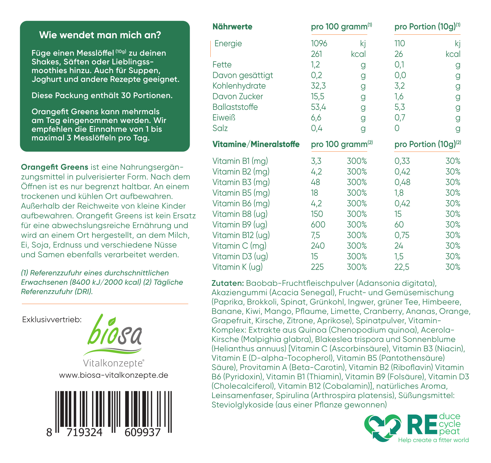 Reichlich Nährstoffe und ein schöner Obst-und Gemüsemix sind in diesem Fruchtpulver enthalten. Mit einem Löffel Orangefit Greens nimmst du 24 verschiedene Obst- und Gemüsesorten zu dir. Somit ist dein täglicher Vitaminbedarf bereits zu 1/3 gedeckt!
