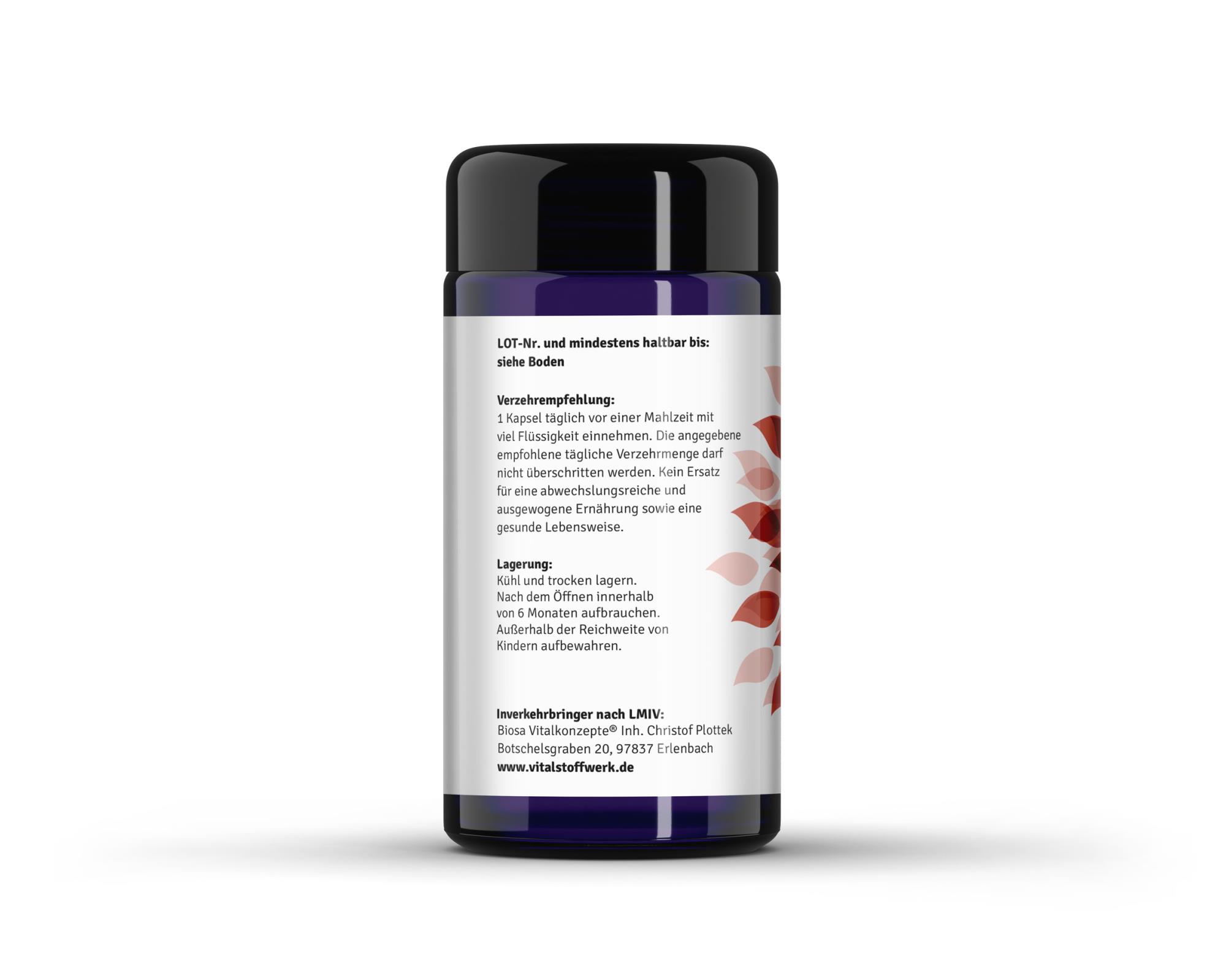 - Kapselhülle: Hydroxypropylmethylcellulose (HPMC), rein pflanzlich