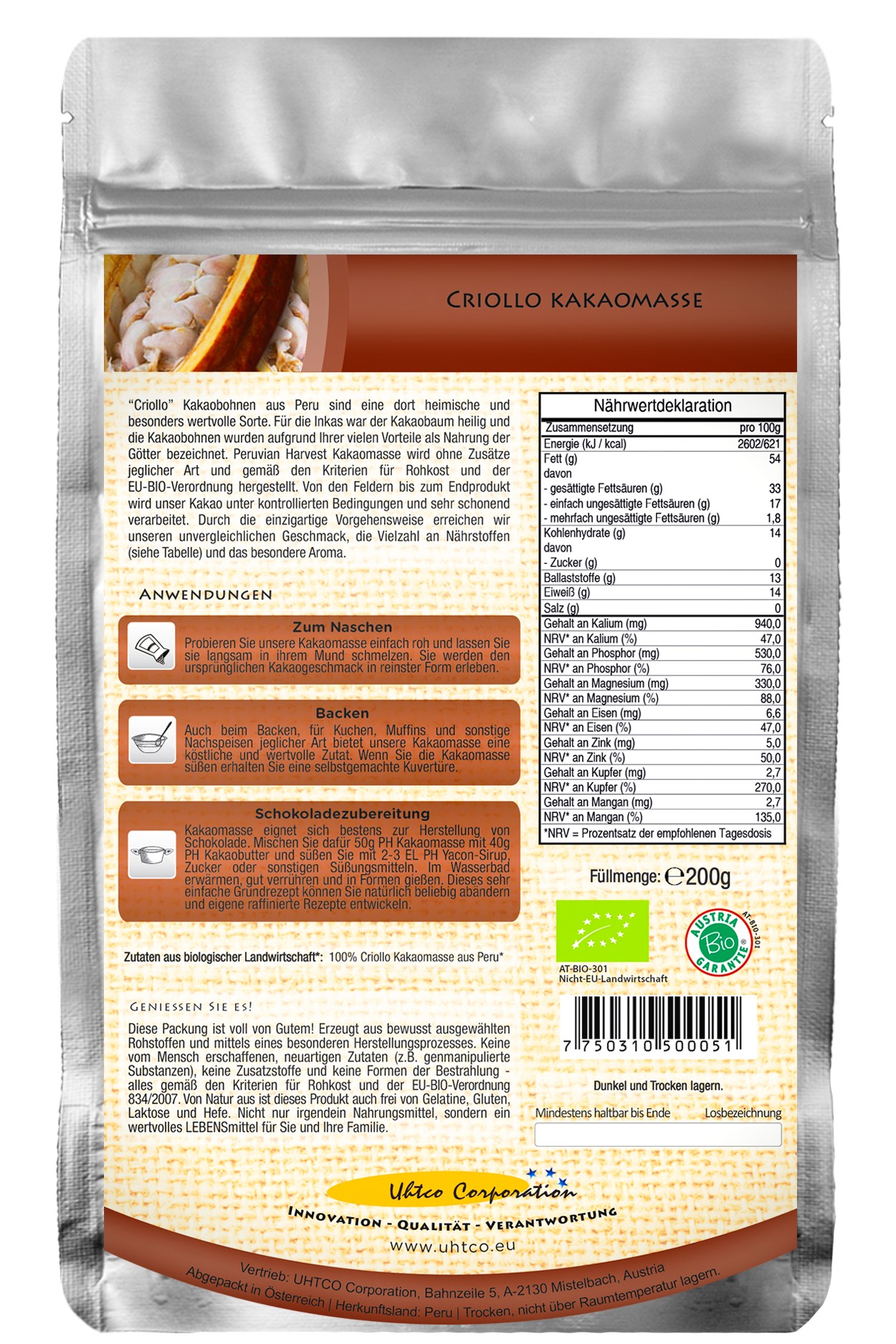 "Criollo" Kakaobohnen aus Peru sind eine dort heimische und besonders wertvolle Sorte. Peruvian Harvest Kakao-Masse wird ohne Zusätze jeglicher Art und gemäß den Kriterien für Rohkost und der EU-BIO Verordnung hergestellt. Von den Feldern bis zum Endprodukt wird unser Kakao unter kontrollierten Bedingungen und sehr schonend verarbeitet. Durch die einzigartige Vorgehensweise und die schwache Fermentierung erreichen wir unseren unvergleichlichen Geschmack, die Vielzahl an Nährstoffen und das besondere Aroma.