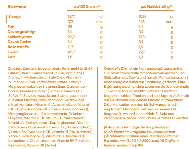 Zutaten:Erbsenprotein, Hafermehl (enthält Gluten), Inulin, Leinsamenöl-Pulver, natürliches Aroma, Tri-Kaliumcitrat, High-Oleic-Sonnenblumenöl-Pulver, koffeinfreier Kaffee-Extrakt, Magnesiumsalze der Zitronensäure, Calciumcarbonat, Grüntee-Extrakt (Camellia Sinensis L.), Süßstoff: Steviolglycoside aus Stevia (gewonnen aus einer Pflanze), Natriumchlorid, Verdickungsmittel: Xanthan, Vitamin C (Ascorbinsäure), Vitamin E (D-Alpha-Tocopherol), Vitamin B3 (Nicotinamid), Mangangluconat, L-Selenmethionin, Zinkcitrat-Dihydrat, Vitamin B5 (Calcium-D-Pantothenat), Vitamin A (Retinylacetat), Kupfergluconat, Vitamin B12 (Cyanocobalamin), Vitamin D3 (Cholecalciferol), Vitamin B6 (Pyridoxin HCI), Vitamin K1 (Phyllochinon), Vitamin B2 (Riboflavin), Vitamin B1 (Thiamin HCI), Kaliumiodat, Chrompicolinat, Vitamin B9 (Folsäure), Eisenzitrat, Vitamin B8 (Biotin).