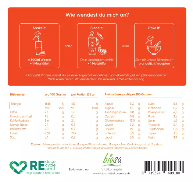 - Durch die Verwendung der gelben Spalterbse enthält der Shake hervorragende pflanzliche Proteinquellen und alle Aminosäuren, die dein Körper benötigt
