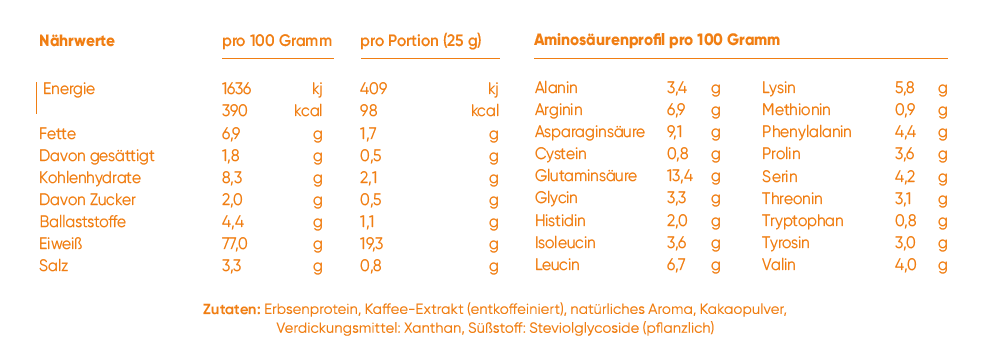 Zutaten: Erbsenprotein, Kaffee-Extrakt (entkoffeiniert), natürliches Aroma, Kakaopulver, Verdickungsmittel: Xanthan, Süßstoff: Steviolglycoside (pflanzlich)