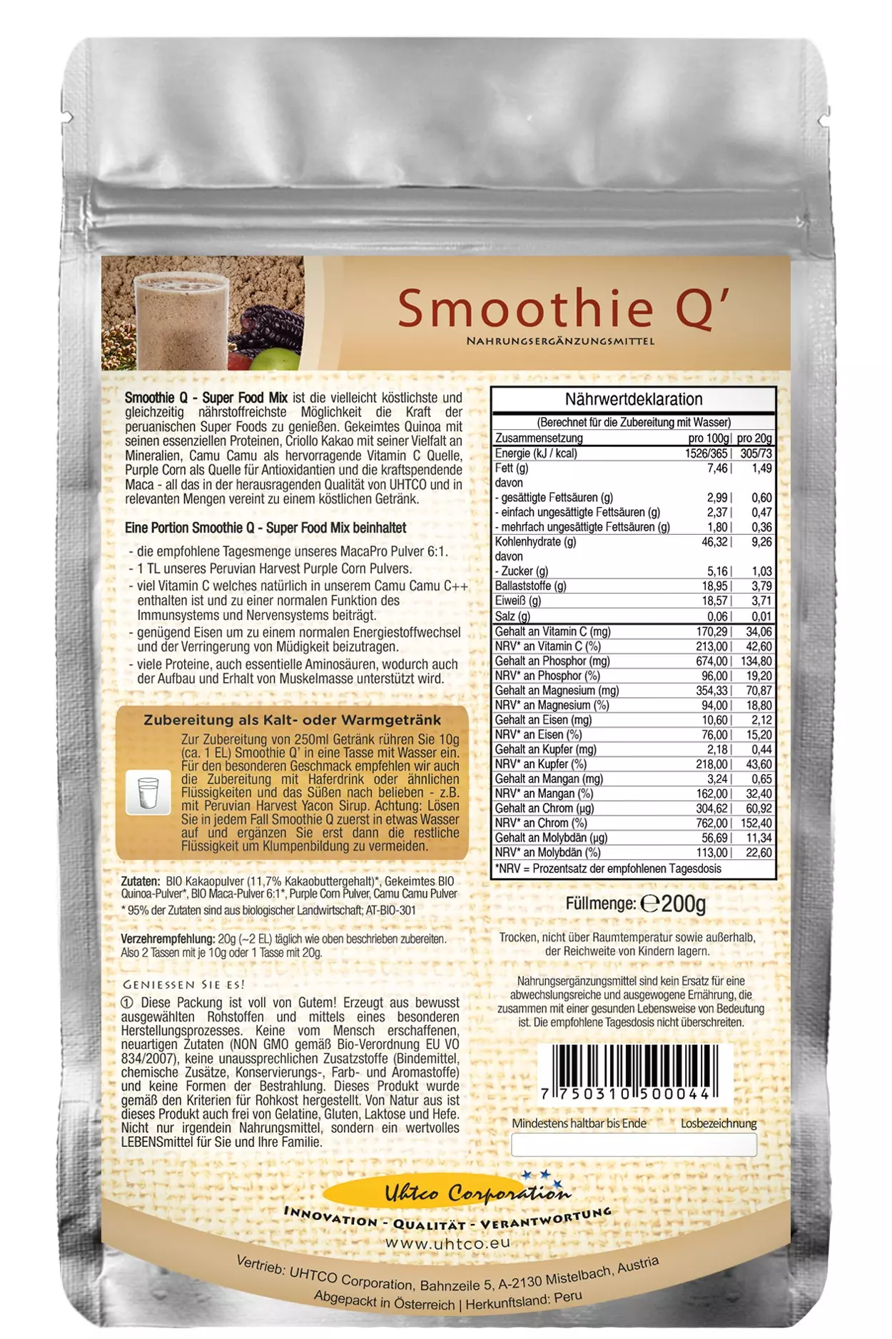 Smoothie Q - Super Food Mix - ein Mix von unseren besten Superfoods vereint in einem Pulver. Unser Kakao sorgt für reichlich Mineralien, das gekeimte Quinoa für alle essentiellen Proteine, Camu Camu für viel Vitamin C, Purple Corn für wertvolle Antioxidantien und unser MacaPro 6:1 für den Energie-Kick und zusätzliches Wohlbefinden - einfach mit Wasser oder Milch anmischen und nach Belieben Süßen. Ein unverschämt reichhaltiges Nährwertprofil für fast jede Lebenslage!