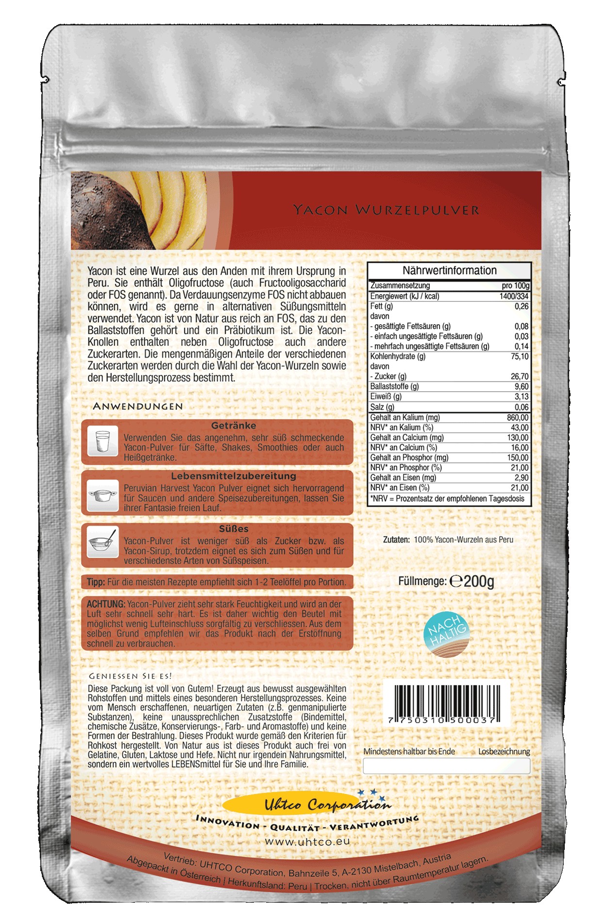 - Achtung: Yacon-Pulver zieht sehr stark Feuchtigkeit und wird an der Luft sehr schnell sehr hart. Es ist daher wichtig den Beutel mit möglichst wenig Lufteinschluss, sorgfältig zu verschließen. Aus dem selbem Grund empfehlen wir das Produkt nach der Erstöffnung schnell zu verbrauchen.